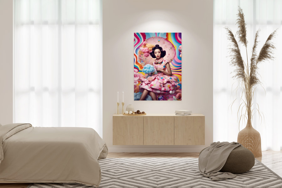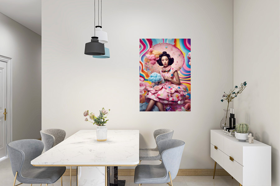 Illusions of Dream is a captivating AI generated art print unveils a mesmerising dreamscape, where a woman’s form merges seamlessly with a swirling vortex of vibrant colours and ethereal patterns. Her enigmatic gaze, beckoning the viewer to delve deeper into this surreal realm, where illusions dance and dreams take flight.